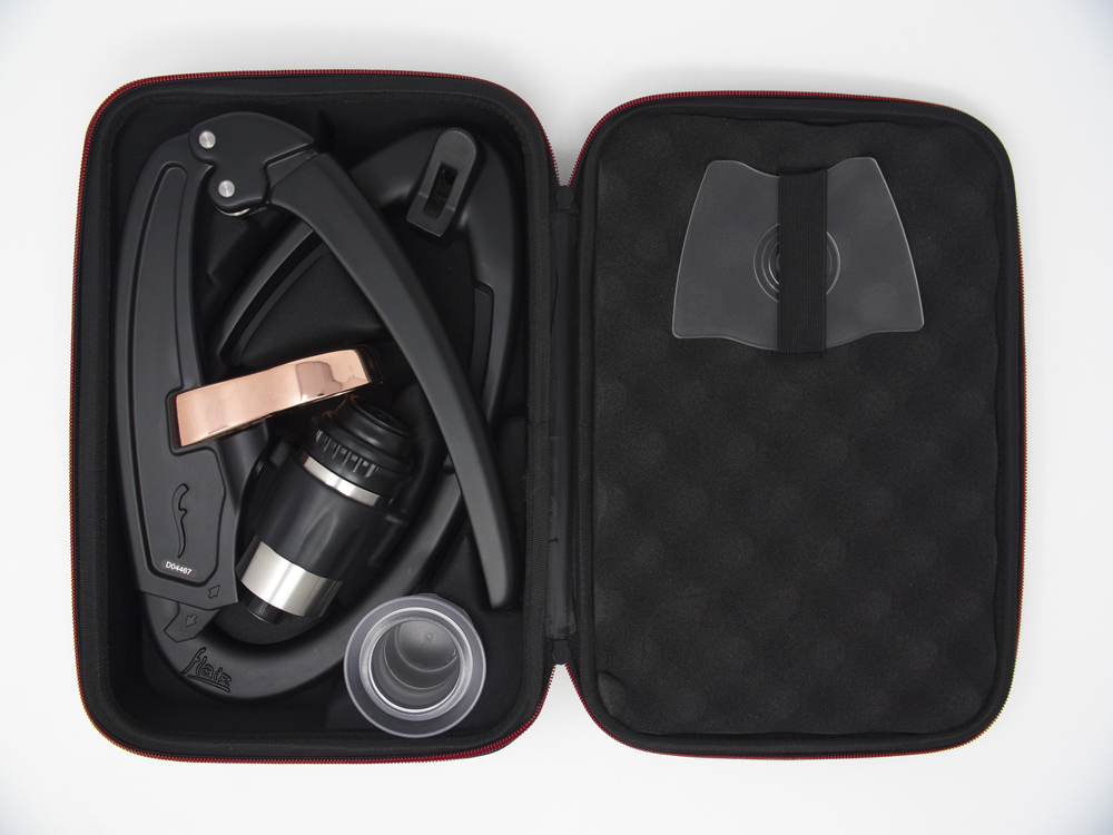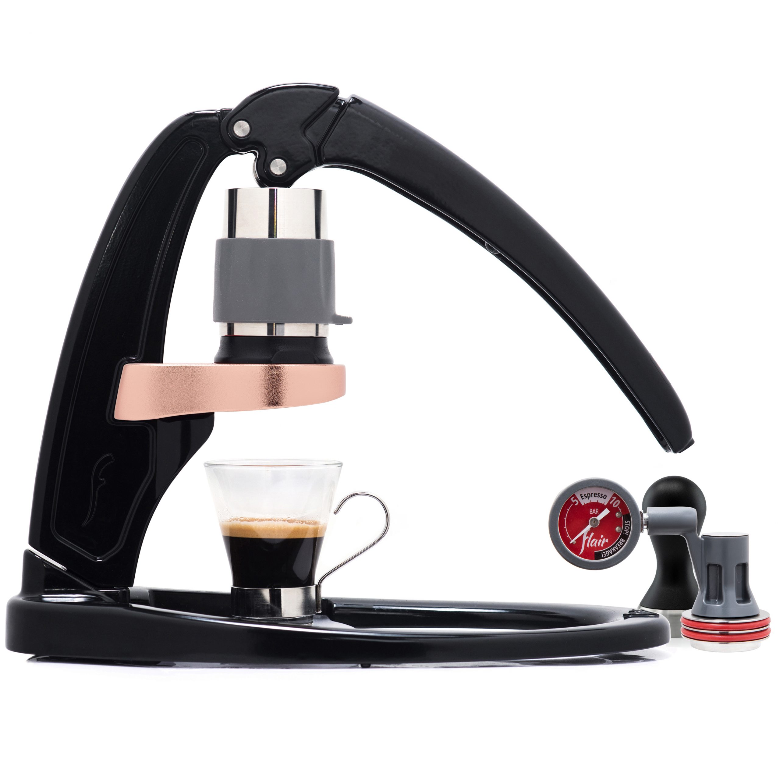 Base Matte Black, White or Chrome Base, Matte Black, White or Chrome Post & Lever with Copper-Plated Portafilter Base, Custom pressure gauge, stem, stainless steel plunger and pressure gauge guard, Bottomless 2-in-1 Portafilter, Stainless Steel, Dispersion Screen, Brewing Cylinder, Dosing Cup, Funnel, Drip Tray, Stainless Steel Tamper, Carrying Case, Screw for Affixing Post to Base Permanently, Brewing Guide